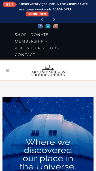 100%Contact Mount Wilson Observatory Want to plan a visit, schedule a private tour, or learn more about our programs? You’ve come to the right place. Use the form below or reach out directly—we’re happy to help you connect with the right person on the mountain. General Inquiries:626-214-8030 Please be aware we are not able to […]