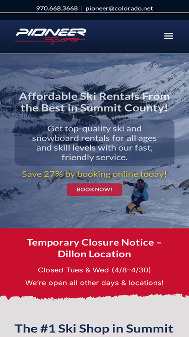 74%Affordable ski rental packages with Pioneer Sports in Frisco and Dillon, CO. Enjoy quick service, quality gear, and unbeatable discounts!