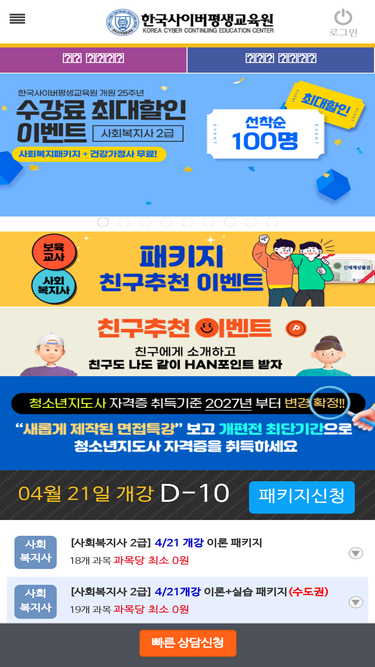 79%교육부인가, 사회복지사, 보육교사, 한국어교원, 장애영유아, 청소년지도사, 경영학, 전과목개설, 전국개강 one-stop 패키지할인!