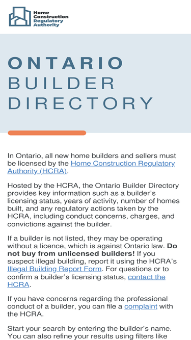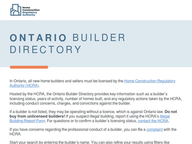 73%as ontario’s home builder regulator, the hcra provides access to a searchable database with information about ontario’s approximately 5,000 licensed home builders and vendors. some of the information that the directory provides includes whether a builder you are considering is licensed, has had any convictions, the number of homes they have built, and their warranty history. we recommend that you start your research with the ontario builder directory - the official source of information about licensed builders and vendors in ontario.