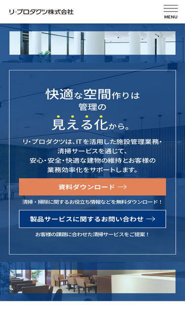 リ・プロダクツが提供する各種資料が、こちらのページからダウンロードして閲覧いただけます。当社の清掃サービスやお掃除ロボットに関する資料、会社案内、建物の維持管理に関するお役立ち資料などが無料でご確認いただけます。