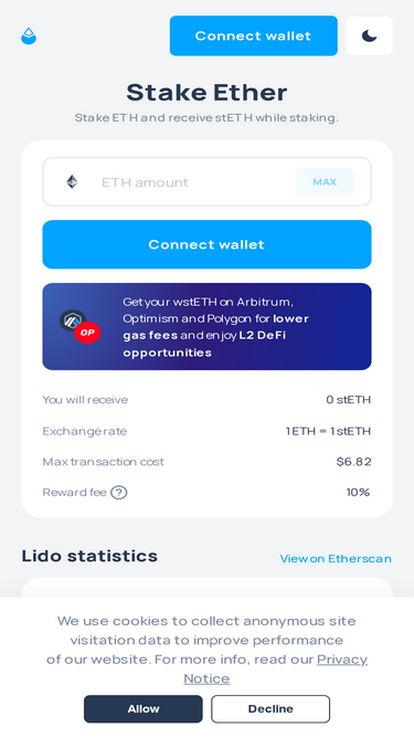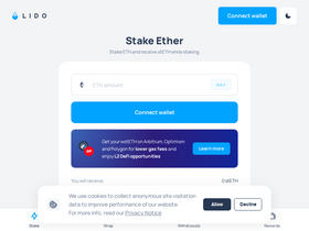 80%Liquid staking with Lido. Stake Ether with Lido to get daily rewards while keeping full control of your staked tokens. Start receiving rewards in just a few clicks.