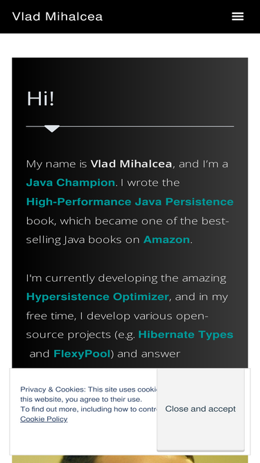 87%Hi! My name is Vlad Mihalcea, and I’m a Java Champion. I wrote the High-Performance Java Persistence book, which became one of the best-selling Java books on Amazon.I'm currently developing the amazing Hypersistence Optimizer, and in my free time, I develop various open-source projects (e.g. Hypersistence Utils and FlexyPool) and answer questions on StackOverflow. BlogI've been blogging since 2013 about Java, JPA, Hibernate, Spring, SQL, and database systems (e.g., Oracle, SQL Server, PostgreSQL, MySQL). READ MY BLOG BookI wrote and published a book called High-Performance Java Persistence, which has been read by thousands of Java developers all... Read More
