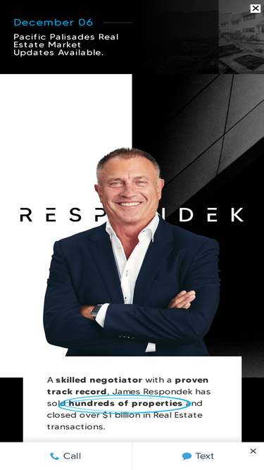 81%The name James Respondek is synonymous with fine real estate in the coveted communities of Pacific Palisades, Malibu, Santa Monica, Brentwood, and Bel Air. He has sold hundreds of homes to Generations of Palisadians.
