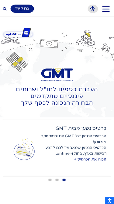 60%העברת כספים לחו"ל ושרותים פיננסיים מתקדמים הבחירה הנכונה לכסף שלך קל. מהיר. בטוח. בדיוק בשבילך. myGMT תכירו את האזור האישי שלכם - זמין לכם ובשבילכם בכל זמן ובכל מקום. אז מה אתם יכולים לעשות עם myGMT? לשלוח כסף לחו"ל ולשלם…