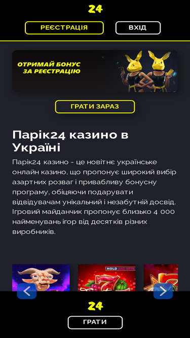 83%Грати зараз Парік24 казино в Україні Парік24 казино - це новітнє українське онлайн казино, що пропонує широкий вибір азартних розваг і привабливу бонусну програму, обіцяючи подарувати відвідувачам унікальний і незабутній досвід. Ігровий майданчик пропонує близько 4 000 найменувань ігор від десятків різних виробників. Почати гру в Парік24 Основні характеристики онлайн казино Парік24: 👓 Назва бренду