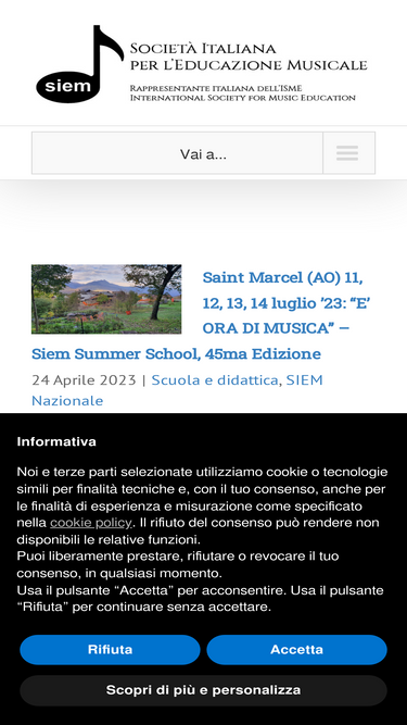 57%Cerca nel sito Categorie SIEM RECAPITI SEDE LEGALE: Società Italiana per l’Educazione Musicale Via Giuseppe D'Annibale, 6 00168 - ROMA RECAPITO POSTALE: c/o SIEM Milano via Ernesto Breda 19/c 20126 – MILANO C.F. 80119310151 – P.I. 04072780374 Tel. 327.9865819 segreteria@siem-online.it presidente@siem-online.it COME ASSOCIARSI Per diventare socio compila il modulo che