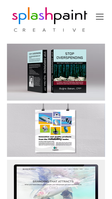 100%Splashpaint Portfolio site, showing examples of completed creative work in the San Francisco Bay Area. Provides Graphic Design, Branding, Writing, and Editing. Projects include Logo Design, Print and Web Ads, Brochures, Newsletters, Books, Illustrations, Retouching, Signage, and Packaging.