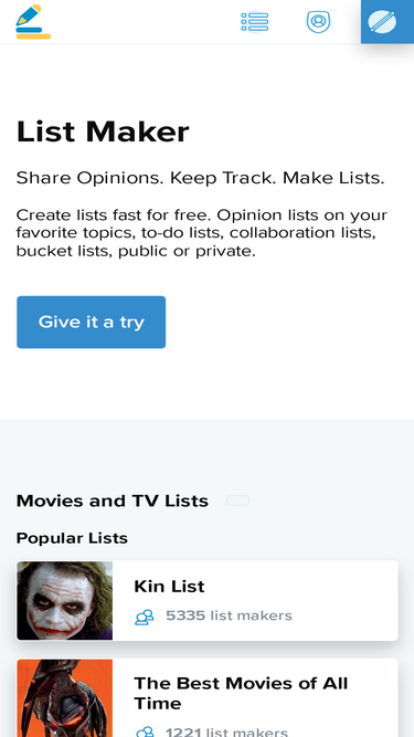 90%Free, fast and simple to use. Make your own lists and see what your friends and others are listing. List movies, video games, characters, music and more.