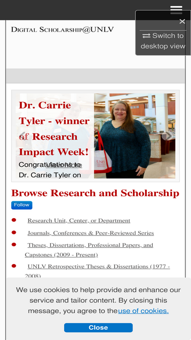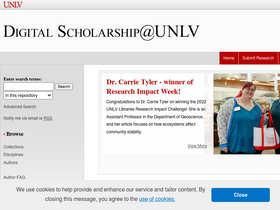 80%the university of nevada, las vegas institutional repository is a service of the unlv libraries. the mission is to capture, preserve, and share the intellectual output of unlv faculty, staff, students, and collaborations with other stakeholders. research and scholarly archived output includes: articles, monographs, journals, university publications, audio/visual presentations, working papers, technical reports, conference papers/posters, theses/dissertations, data sets, and publicly-funded research.