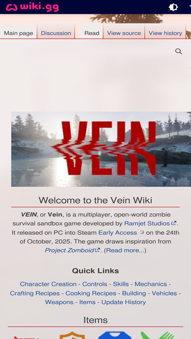 72%VEIN, or Vein, is an upcoming multiplayer, open-world zombie survival sandbox game developed by Ramjet Studios. It will release on PC into Steam Early Access at a to-be-announced date. The game draws inspiration from Project Zomboid. (Read more...) Controls - Mechanics - Crafting Recipes - Cooking Recipes...