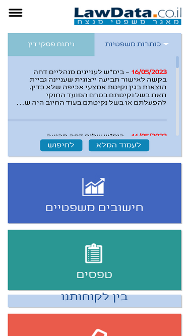 68%המאגר המשפטי של lawdata חושף בפניך עולם חדש של כלים משפטיים מנצחים: פסיקה, חקיקה, כתבי טענות, ניתוח פסקי דין, הצעות חוק, מחשבונים משפטיים. מבית דטה חוק ומשפט.