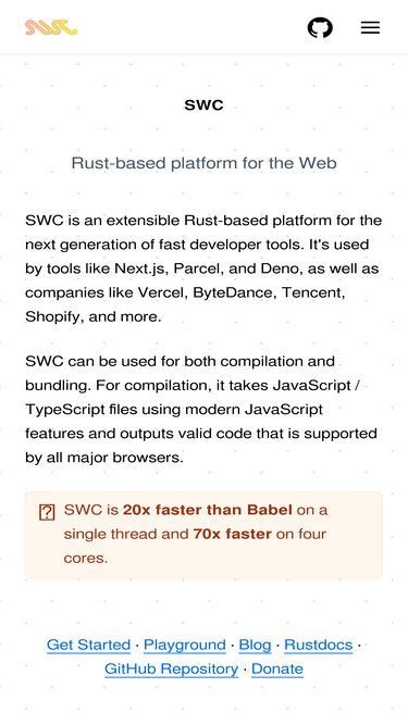 swc is an extensible rust-based platform for the next generation of fast developer tools. it's used by tools like next.js, parcel, and deno, as well as companies like vercel, bytedance, tencent, shopify, trip.com, and more.