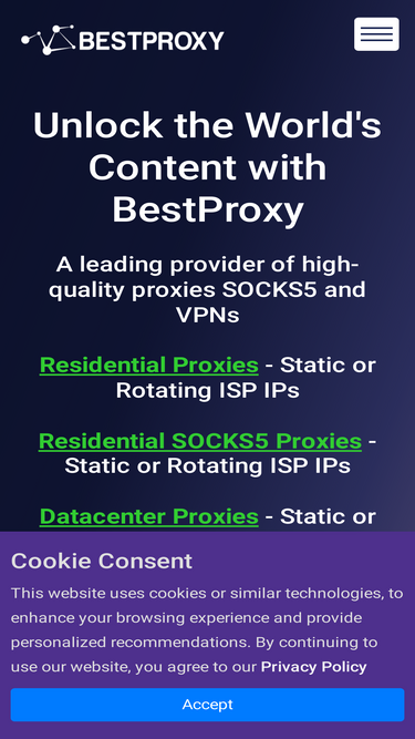 100%bestproxy.net - the best provider of high-quality proxies, socks5 and vpns. residential or datacenter ips, dedicated or shared. 300+ locations . $1.20/mo.