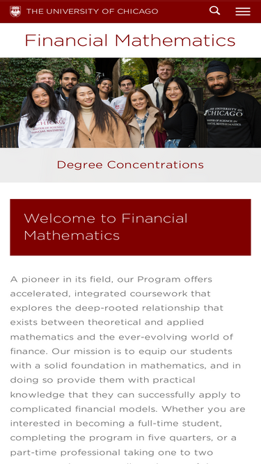 73%the university of chicago’s financial mathematics program offers courses in option pricing, portfolio management, machine learning, and python to prepare students for careers in quantitative finance.