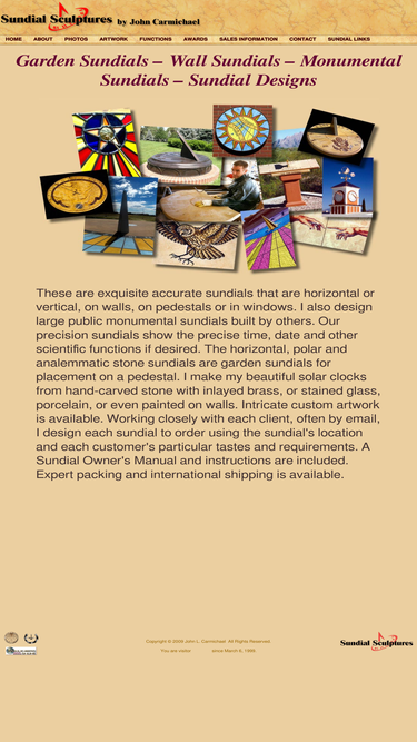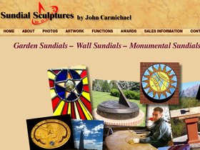 100%sundial sculptures by john carmichael, award-winning american sundial designer and maker, crafts exquisite accurate sundials that are horizontal or vertical, on walls, on pedestals or in windows. he also designs large public monumental sundials. his precision sundials show the precise time, date and other scientific functions if desired. the horizontal, polar and analemmatic stone sundials are garden sundials for placement on a pedestal. these beautiful solar clocks are made from hand-carved stone with inlayed brass, or are of stained glass, porcelain, or are even painted on walls. intricate custom artwork is available. working closely with each client, often by email, all sundials are custom made to order using the sundial's location and each customer's particular tastes and requirements. the sundial owner's manual and instructions are included. expert packing and international shipping is available.