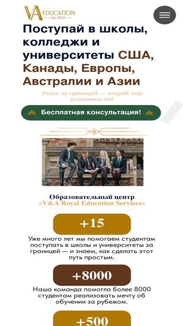 99%V&A Education Services — это команда профессионалов с многолетним опытом в сфере международного образования. Мы сопровождаем студентов на всех этапах поступления в частные школы, колледжи и университеты за рубежом: от первичной консультации до заселен
