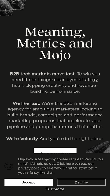Velocity is a B2B marketing agency driving business outcomes from an integrated strategy, creative and performance offering.