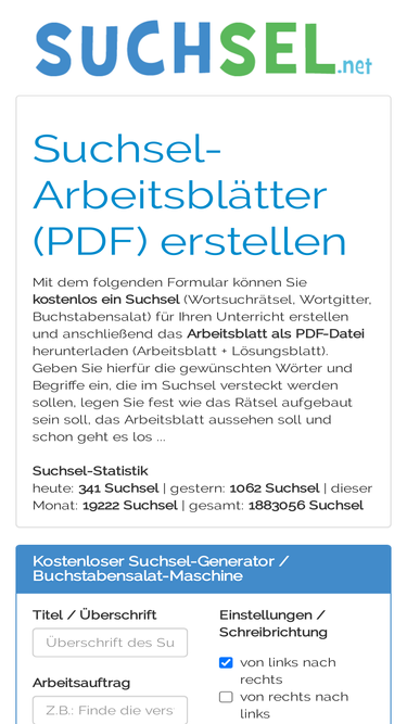 79%erstellen sie ihre eigenen suchsel, worträtsel, suchworträtsel oder wortgitter für ihren unterricht oder für die nächste geburtstagsfeier kostenlos mit dem suchsel-generator. oder durchstöbern sie die rätsel-datenbank mit über 2000 suchrätseln.