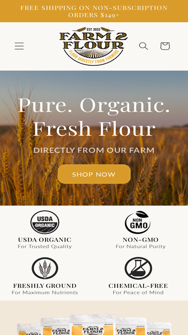 79%Fresh organic stone-milled flour. No additives. No chemicals. No bleach. Our pure flour comes from non-GMO, pesticide-free and herbicide-free crops organically grown on our 4th generation family farm in Illinois. USDA Certified Organic. Experience the Farm2Flour Difference Today!