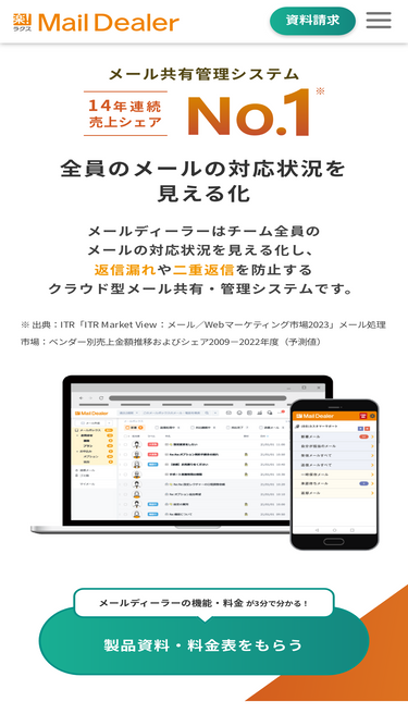 93%メールディーラーは売上シェアNo.1のメール共有管理システムです。チーム全員のメールの対応状況を見える化し、返信漏れ・二重返信を防止するため業務効率を高めます。複数名でのメール管理に最適!導入社数9,000社突破!|ラクスのメールディーラー