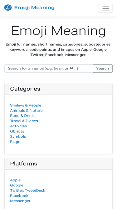 100%Apple, Google, Twitter, Facebook, Messenger-da emoji to'liq nomlari, qisqa nomlari, kategoriyalari, pastki turkumlari, kalit so'zlari, kod nuqtalari va rasmlari.