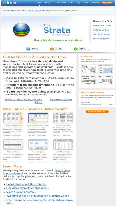 100%kirix strata™ is an ad hoc data analysis and reporting tool built for people who work with, manipulate and analyze structured data. strata is easy to use, has the power you need to work with large files, and helps you get your work done faster.