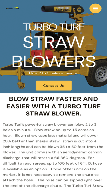 89%turbo turf's straw blower will blow 2-3 bales of straw per minute. this straw blower is 10 times faster than applying straw by hand and provides the same coverage using 20% less straw.