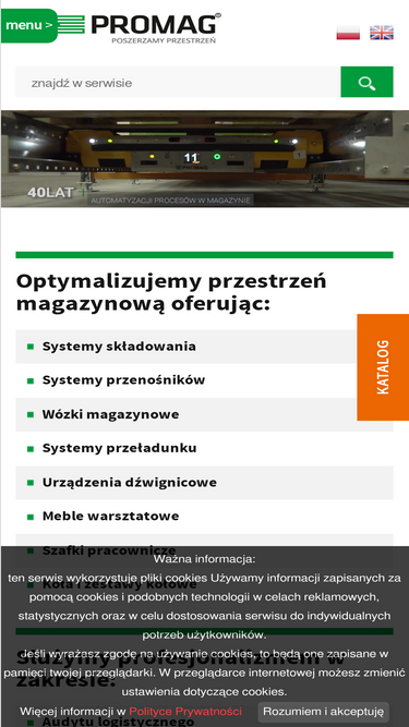 60%promag s.a. - oferuje wózki widłowe, regały magazynowe, wózki paletowe, wciągarki bramowe i doki przeładunkowe. oferta obejmuje także urządzenia przeładunkowe, dźwignicowe i do pakowania. promag s.a. kompleksowo wyposaża magazyny w regały paletowe.