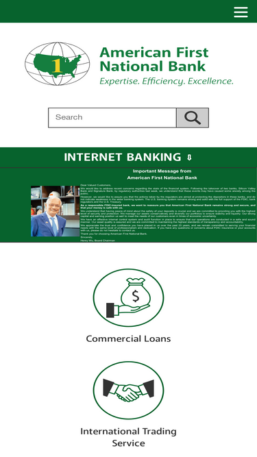 72%American First National Bank is an Asian-American owned National Bank headquartered in Houston, Texas. We are committed to conducting business with the highest ethical standards, operating in a safe and sound manner, and providing a variety of financial services.