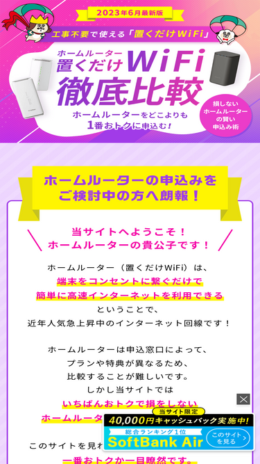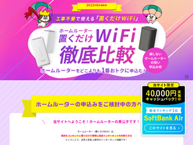 74%ホームルーターの貴公子はホームルーター(置くだけwifi)を提供する窓口が多数存在する中で、月額料金、キャンペーン、端末代など様々な角度から比較をして、あなたにあったホームルーターを見つけることができるホームルーター(置くだけwifi)の比較サイトです。