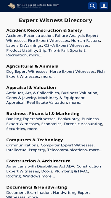 98%jurispro is a free online directory of expert witnesses. please search for an expert witness by name or area of expertise. you may view the expert's qualifications, read their articles, see their photo, and contact the expert directly.