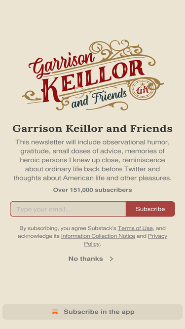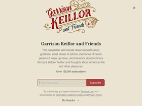 80%This newsletter will include observational humor, gratitude, small doses of advice, memories of heroic persons I knew up close, reminiscence about ordinary life back before Twitter and thoughts about American life and other pleasures. Click to read Garrison Keillor and Friends, a Substack publication with hundreds of thousands of subscribers.