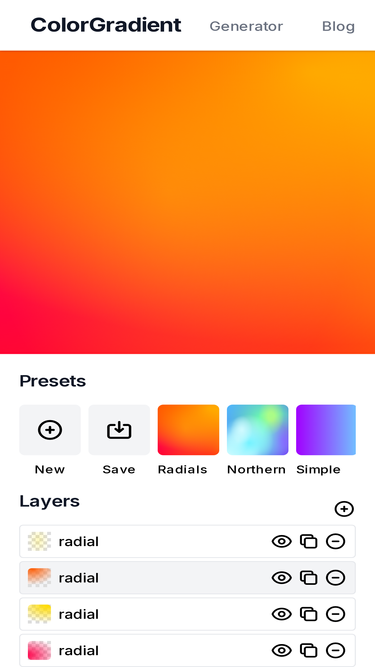 56%Looking for a gradient generator? Color gradient is a CSS gradient generator that is capable of creating simple and more complex gradients.