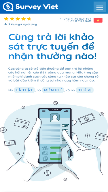 74%Các công ty sẽ trả tiền thưởng để bạn trả lời những câu hỏi nghiên cứu thị trường qua mạng. Hãy truy cập miễn phí danh sách các công ty khảo sát của chúng tôi và bắt đầu kiếm thưởng tại nhà ngay hôm nay nào.