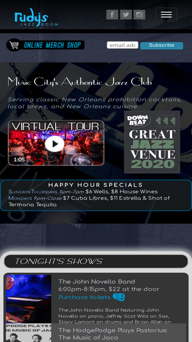 94%nashville's premiere jazz club delivers world-class live music, new orleans food, local brews, and prohibition era cocktails in an intimate and casual setting. the historic space is furnished with persian rugs, armchairs, and colorful moroccan lights giving it the warm feel of a speakeasy. rudy's signature menu items include authentic new orleans chicken, andouille and shrimp gumbo, red beans and rice, po-boys, crawfish grilled cheese, creole seafood pies, beignets and more. each evening features top-notch live music shows with multiple varying styles of jazz groups. rudy’s also hosts private events and parties for your special occasions or corporate get togethers. check out rudy’s event calendar for upcoming shows and events.
