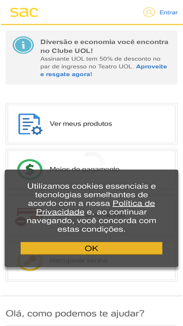 62%UOL SAC: utilize o SAC do UOL para tirar suas d??vidas, recuperar sua senha, quitar seus d??bitos e ver informa????es de cobran??a, de seus produtos e servi??os. Veja mais!