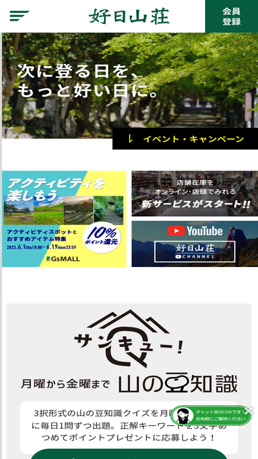 96%全国に60店舗を超えて展開する登山・クライミング・アウトドア用品の総合専門店 好日山荘のオフィシャルサイトです。各店舗のセール情報から好日山荘スタッフによる登山・クライミングレポート、アウトドアギアを紹介する好日山荘マガジンなど様々な登山・アウトドアの情報を発信しています。