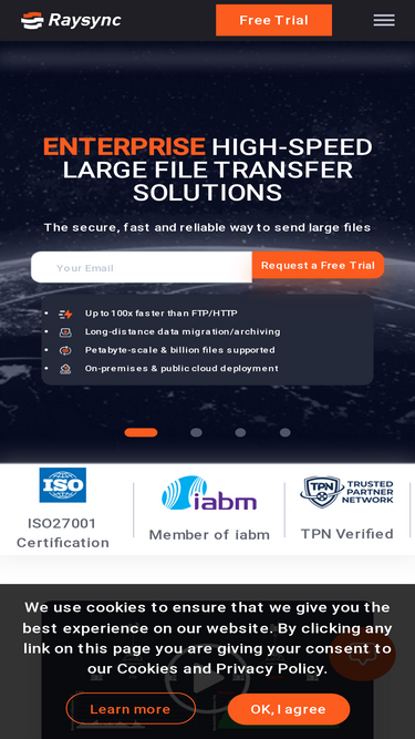100%Raysync provides large file transfer solutions with security, reliability, and efficiency. including large file transfer, SDK application integration, Proxy acceleration, FTP acceleration, and RaySSH acceleration. Raysync enables you to transfer files at maximum speed with minimal packet loss.