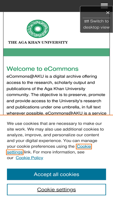 96%ecommons@aku is a digital archive offering access to the research, scholarly output and publications of the aga khan university community. the objective is to preserve, promote and provide access to the university's research and publications under one umbrella, in full text wherever possible. ecommons@aku is a service of the aga khan university libraries.