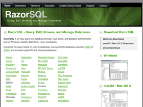 88%razorsql is an sql editor and sql database query tool for macos, windows, linux, and mac os x. razorsql supports mysql, oracle, ms sql server, sqlite, postgresql, db2, sybase, sql anywhere, derby / javadb, firebird, informix, hsqldb, salesforce, simpledb, sql azure, teradata, dynamodb, and many more via odbc or jdbc.