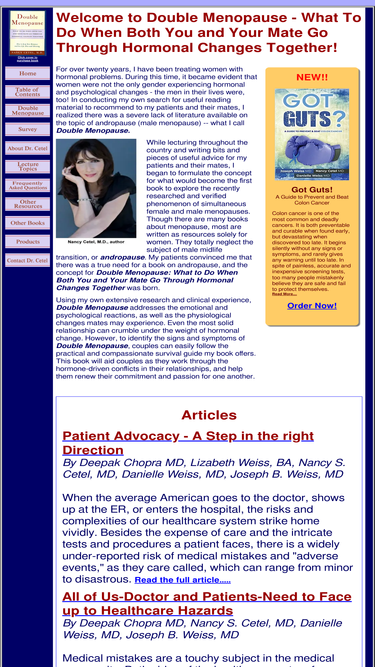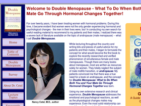 100%The subject of female and male menopause (andropause) are timely topics covered in Dr. Nancy Cetels book Double Menopause. She looks at the midlife changes that take place in both sexes and how to deal with them.