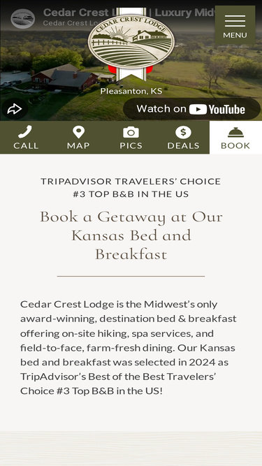 79%Top 10 US B&B by TripAdvisor—our Kansas inn offers luxury rooms, spa, pool, and farm-to-table meals on 100+ scenic acres.