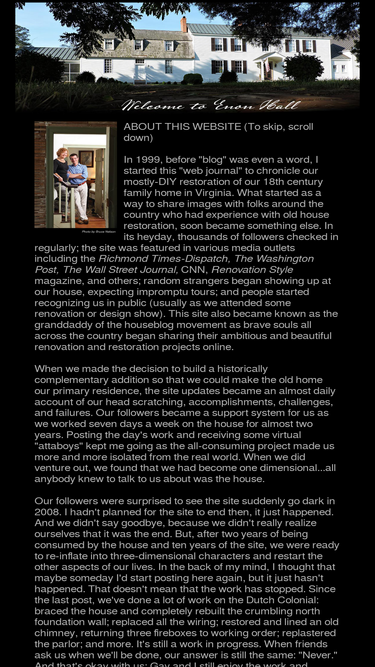 since 1999 this site has chronicled the restoration of 18th century enon hall in lancaster county, virginia by a family descended from its original residents.
