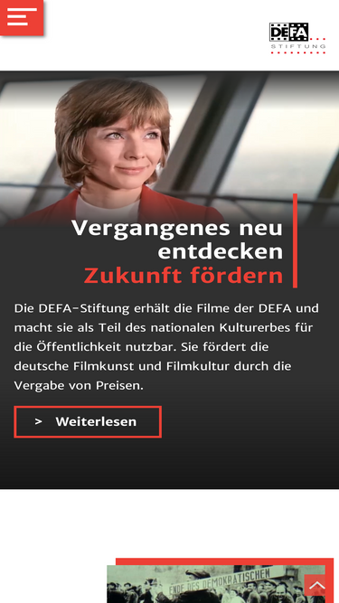 85%DEFA - Die DEFA-Stiftung erhält die Filme der DEFA und macht sie als Teil des nationalen Kulturerbes für die Öffentlichkeit nutzbar. Sie fördert die deutsche Filmkunst und Filmkultur durch die Vergabe von Projektmitteln, Stipendien und Preisen.