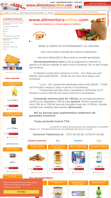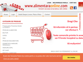 100%Alimentaraonline.com - Bine ai venit in hypermarketul nostru online, unde iti propunem o gama completa de produse! AlimentaraOnline este un supermarket online ce ofera o gama larga de produse alimentare, alimente, bauturi, pa, alcoolice, detergenti, produse curatenie. Livram acasa si la birou din 2006!