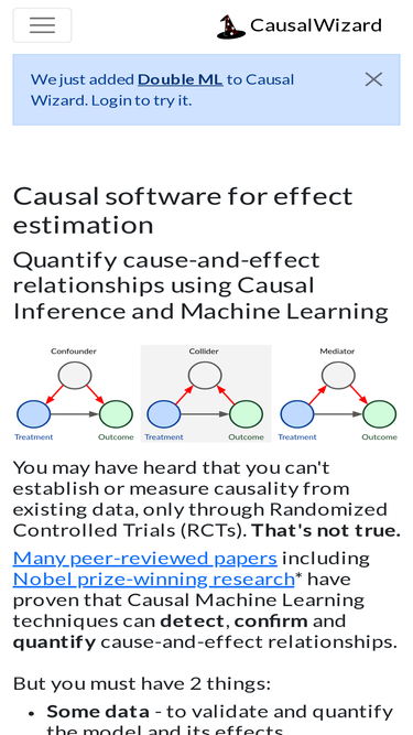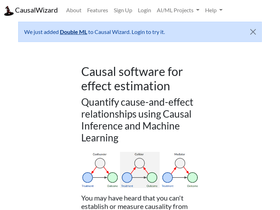100%explore cause and effect in historical data; predict the effects of counterfactual scenarios and other interventions using the latest causal inference methods and machine learning tools, in an online web-app software. causal wizard provides graphical causal software toosl for causal ml risk analysis, asset management, product research, market research, user research, and industrial process optimization.