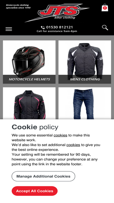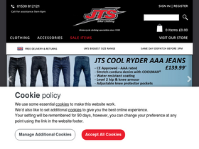 65%jts biker clothing established since 1990. we have the most extensive range of motorcycle clothing sizes in the uk, with motorcycle trousers and jeans available in 5 leg lengths, sizes from 28-60 inch waist. jackets also in many different sizes and colours, sizes 36-66 inch chest. we have a great range of boots too with some designs in wide fit!