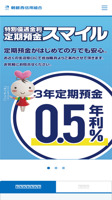 85%朝銀西信用組合のwebサイトへようこそ。インターネットバンキングはもちろん、口座開設、各種ローン、個人向けサービスから、法人向け各種事業サポートまでご案内しています。