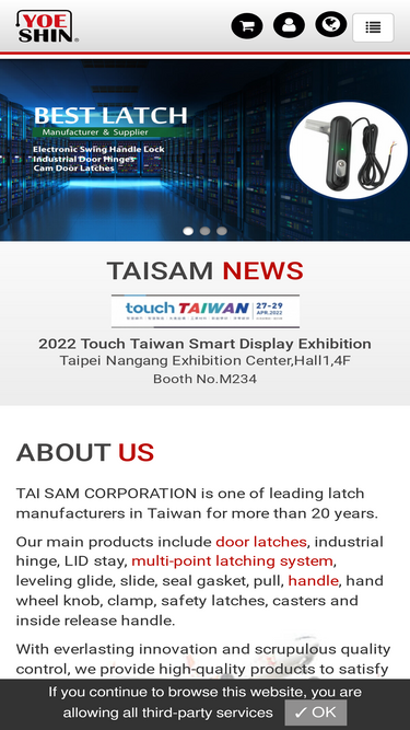 100%允際有限公司為專業承製尼式鉸鏈,不鏽鋼把手和崁入式把手,搭扣,腳座,隱藏式鉸鏈,箱扣,不鏽鋼鉸鍊,工業用輪,不鏽鋼門鎖,氣壓棒,鉸鏈,門扣等各種五金零件公司,產品適用於5g outdoor以及5g智慧燈桿配件各式箱櫃體、船舶、半導體設備、及機械鈑金,產品廣泛應用於:ai人工智慧及邊緣運算控制伺服器、數位電子看板、電動車充電樁、 智慧照明、環境氣候偵測、科技執法、交通號誌監測、道路排水控制等各項智慧城市解決方案 ,追求零件美感與性能是允際的長期方針,我們秉持不斷的創新與嚴格的品質管制,以提供更優質的產品滿足消費者需求,除此之外,我們以競爭性價格及迅速的交貨提昇市場的競爭力,敬請給予指教,謝謝。